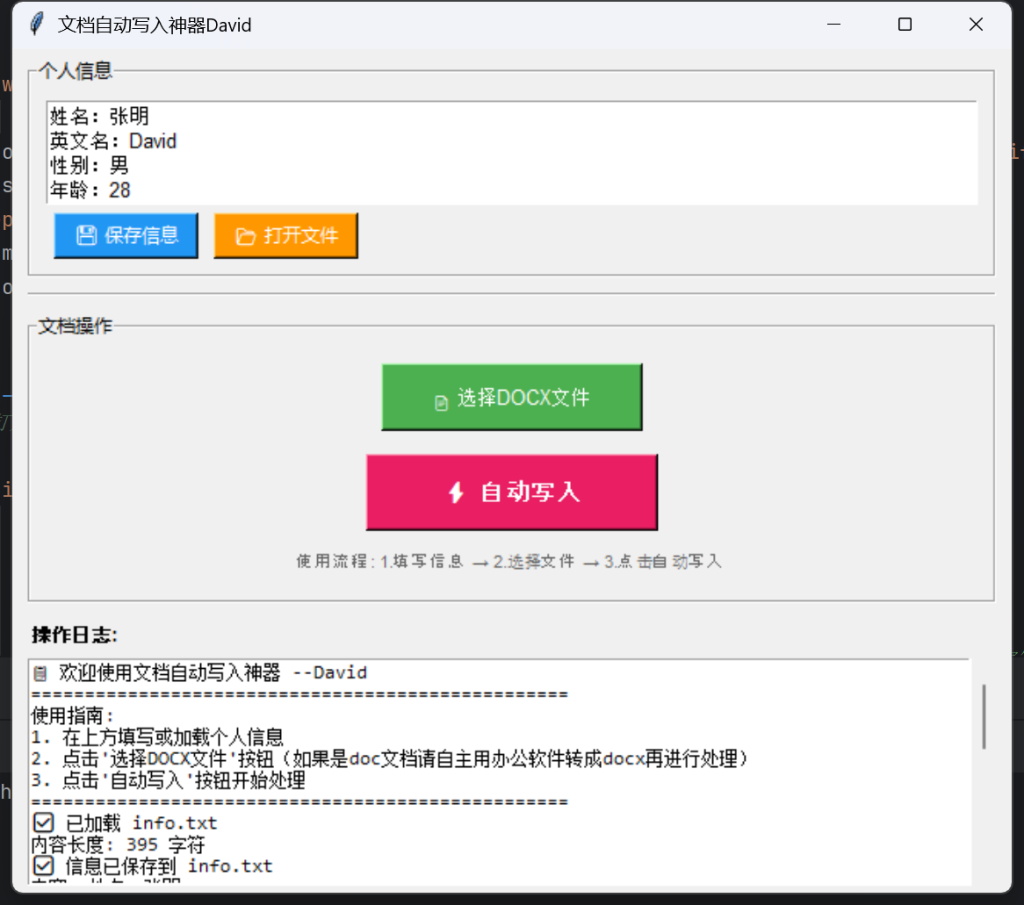 使用TKinter库做用户交互窗口,按键点击事件为选择个人信息和选择写入文件